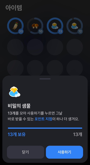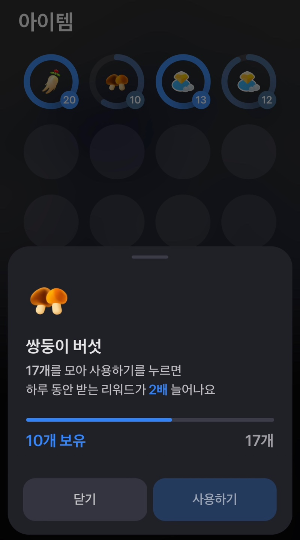 쌍둥이 버섯은 17개를 모으면 사용할 수 있습니다. 쌍둥이버섯을 사용하면 하루 동안 받은 리워드가 2배가 됩니다.